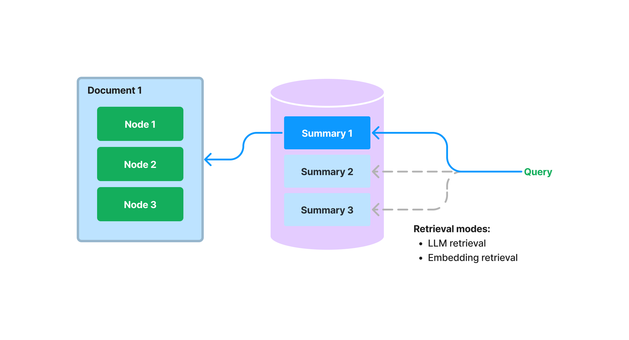 Storing summaries for a document also enables LLM-based retrieval. Instead of feeding the entire document to the LLM in the beginning, we can first have the LLM inspect the concise document summary to see if it’s relevant to the query at all. This leverages the reasoning capabilities of LLM’s which are more advanced than embedding-based lookup, but avoids the cost/latency of feeding the entire document to the LLM