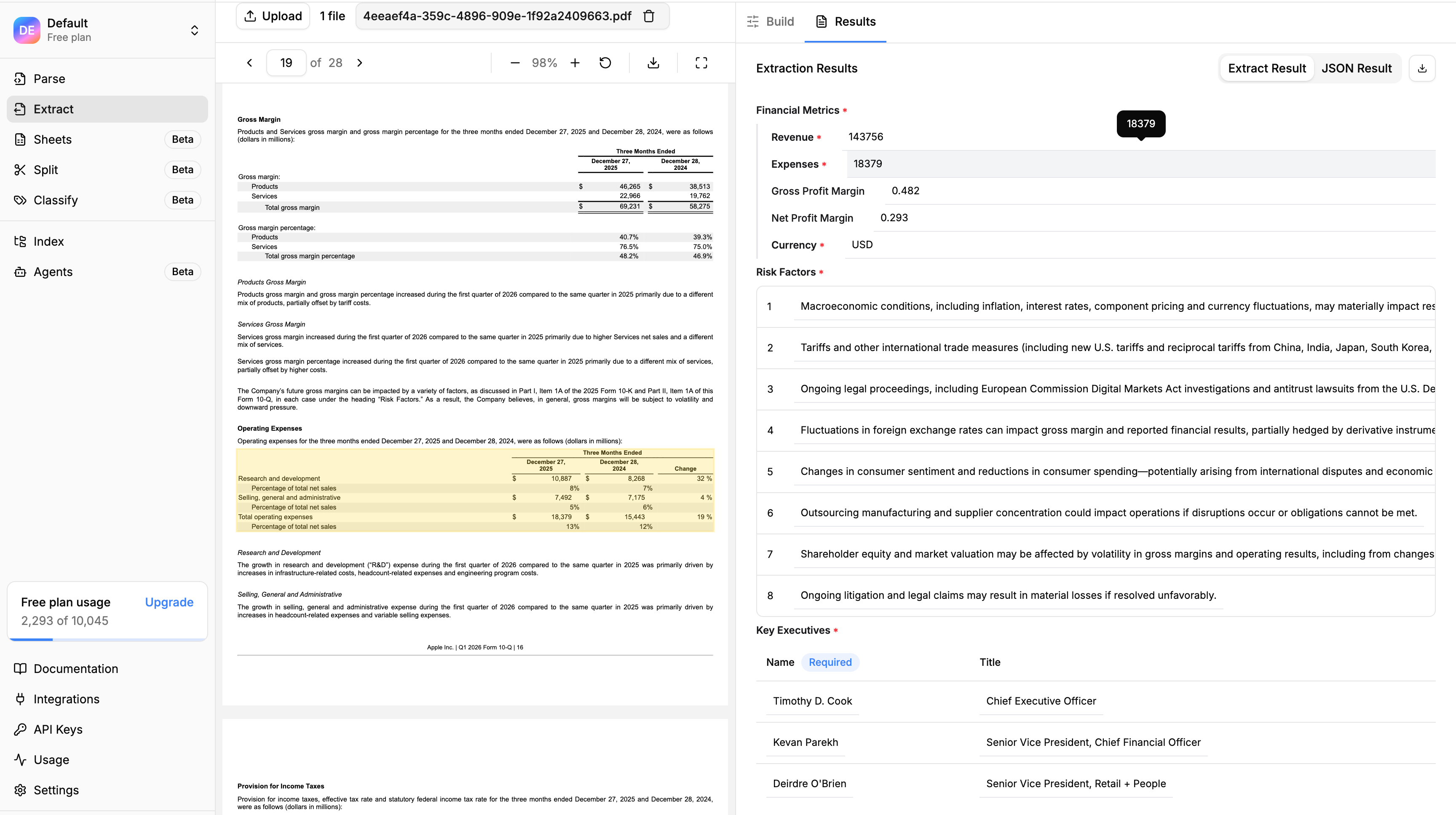 Investment analysts reviewing 10-K filings need to extract risk factors, revenue breakdowns, and management commentary, but they also need to know exactly where each disclosure appears. Page-level extraction lets analysts quickly validate extracted figures against source pages, essential when billions of dollars ride on the accuracy.