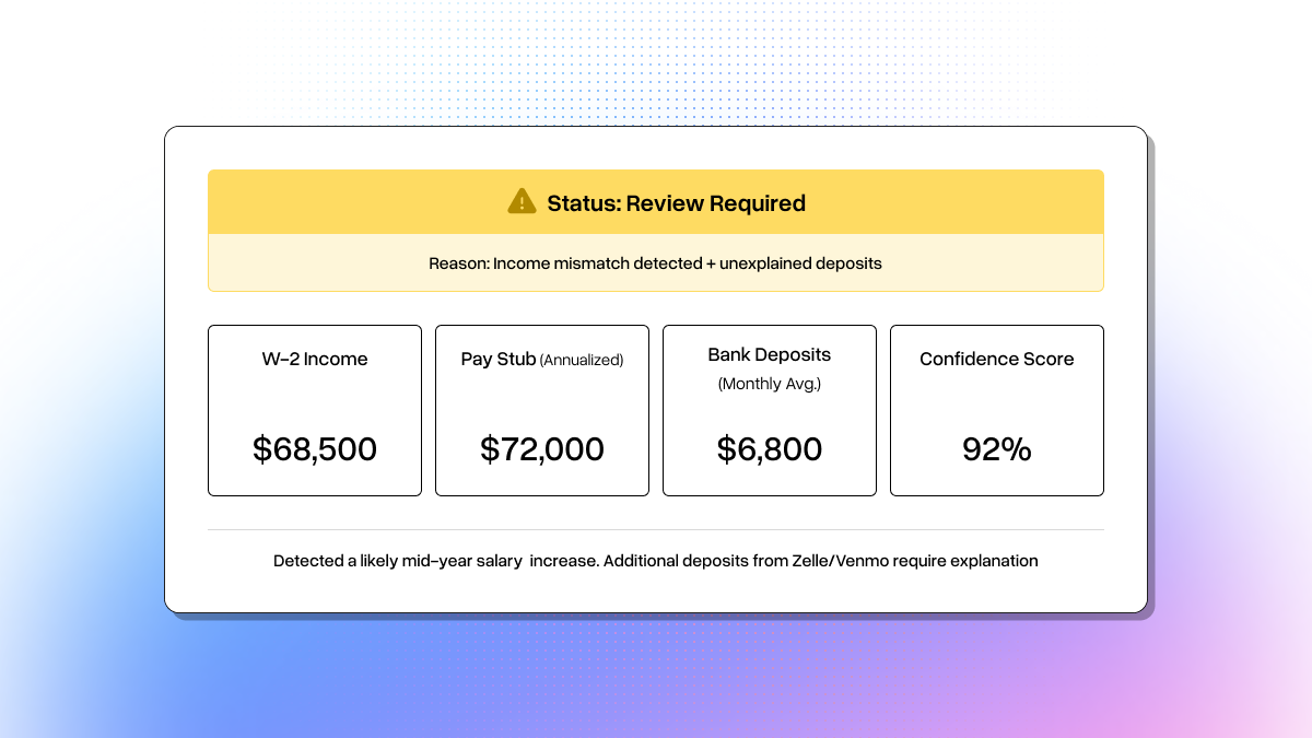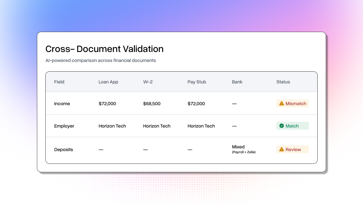 The core challenge is income consistency. The same income figure needs to be verifiable across the loan application (stated income), W-2 (employer-reported annual income), pay stub (current pay rate), and bank statement (actual deposit patterns). Discrepancies like a recent raise, unexplained deposits, or employer name abbreviations are exactly what a processor must catch and document before submitting to underwriting. Companies like Ocrolus have built entire products around automating this cross-source validation.