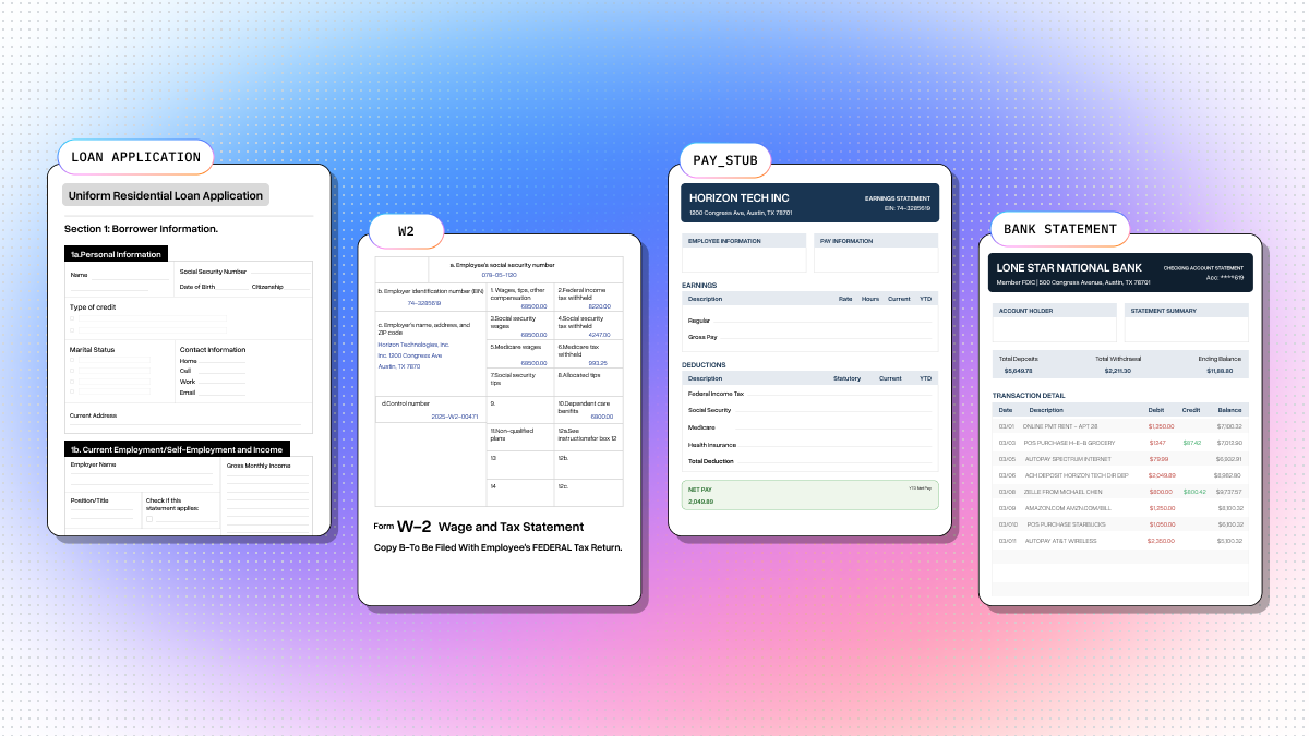 - Extract structured data from 4 documents (loan application, W-2, pay stub, bank statement) using Extract