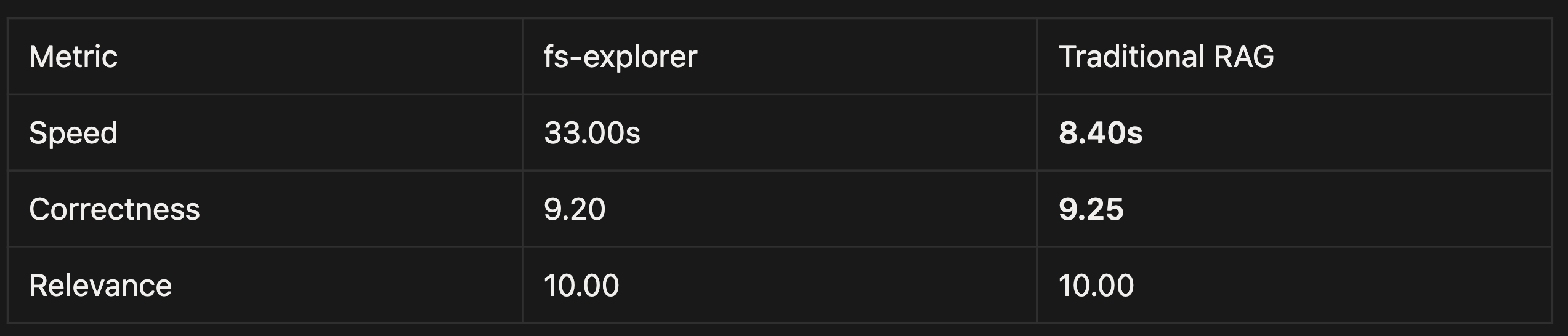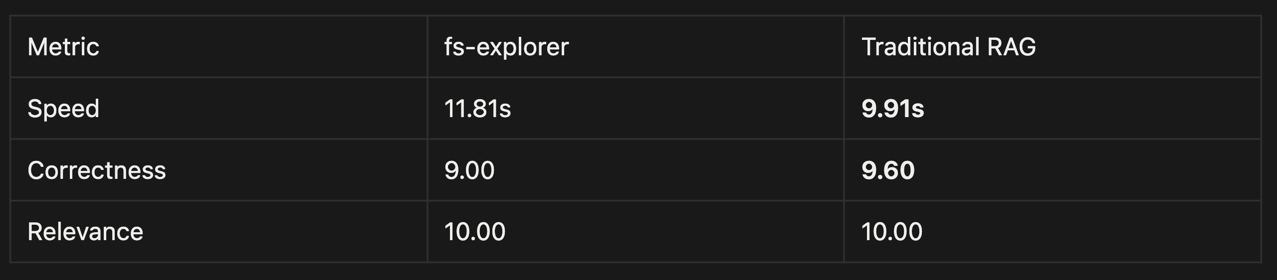 We decided to address these questions by carrying out an experiment, putting our fs-explorer agent to the test against a traditional Retrieval Augmented Generation system.