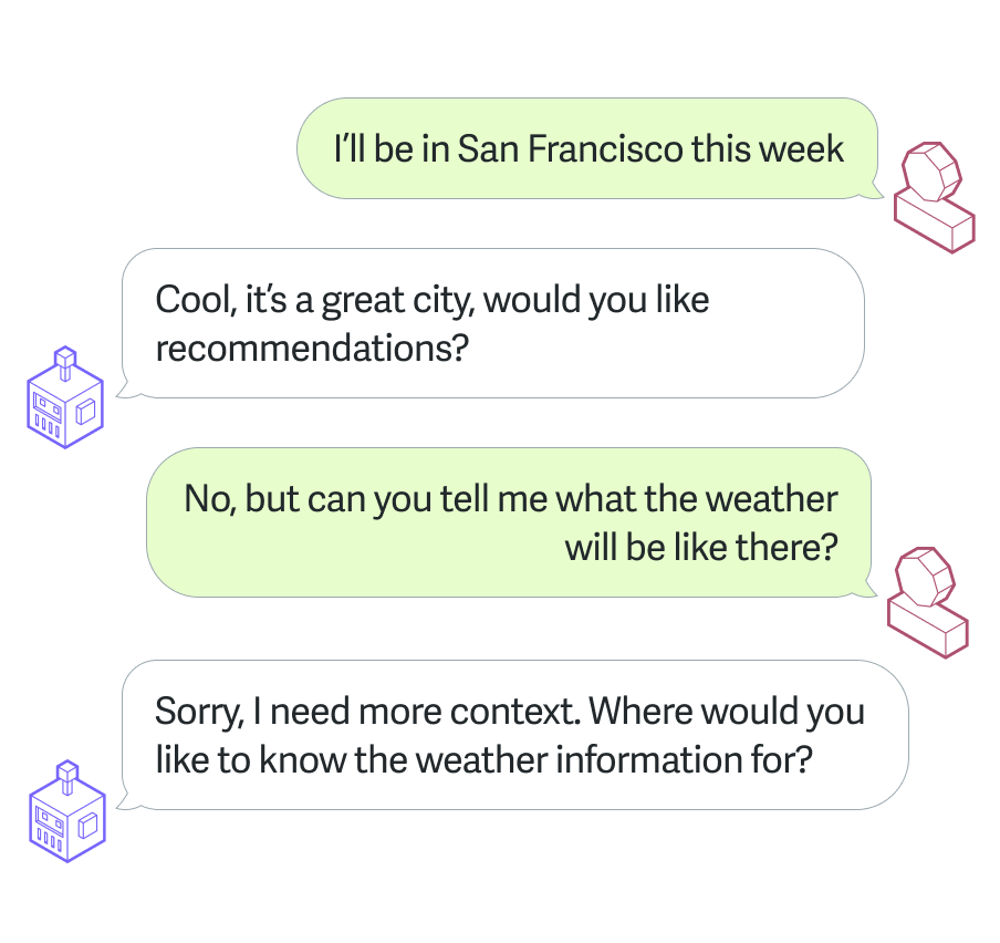 Notice how by the time I get to my second question, the agent is not able to provide me with any answers. The simple reason is that it has no context as to what ‘there’ is in the sentence ‘Can you tell me what the weather is like there?’.