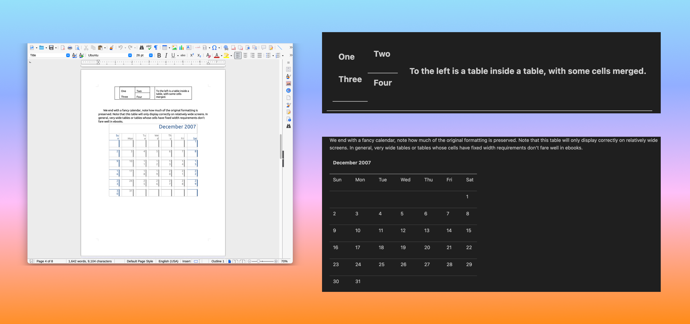 Tables with merged cells and nesting. Column spans, row spans, and tables inside table cells are hard to extract correctly from a rendered page. In the Word XML, merged cells are explicit attributes, not spatial inferences. Here's a doc with a nested table (table-in-table with merged cells) and a calendar with complex row/column spans.