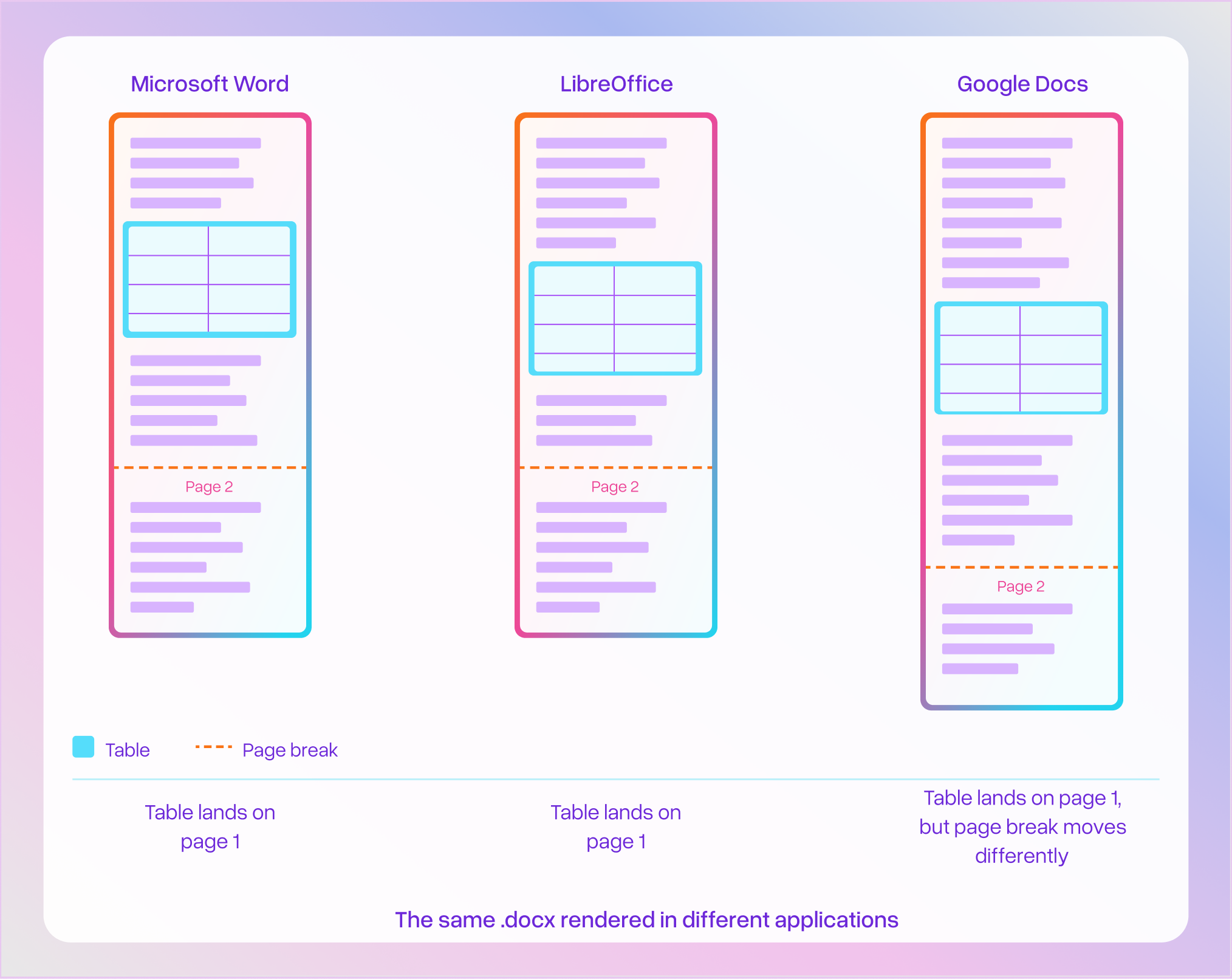 The same .docx can paginate differently in Microsoft Word, LibreOffice, and Google Docs. For a parser that needs to produce page-level output, this creates a real challenge: the XML has rich structural content that converts cleanly to markdown, but no way to know which page a given table belongs to without actually rendering the document.