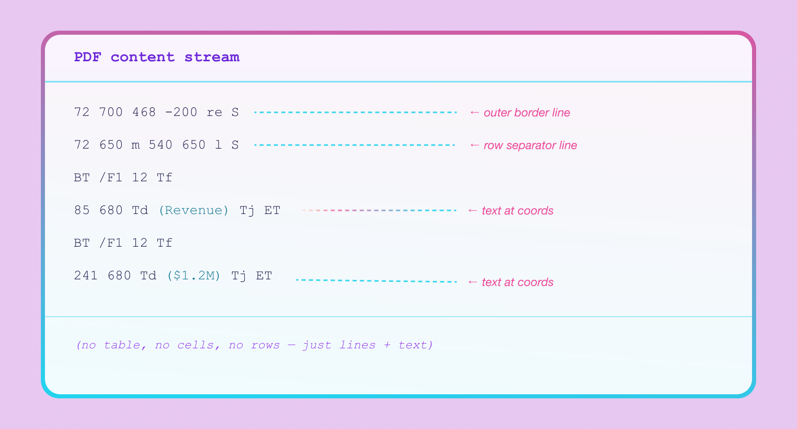 There's no table element, no cells, no formatting tags — just line segments and text positioned at absolute coordinates. I wrote about this in Why Reading PDFs Is Hard. A parser looking at a PDF has to detect line intersections to infer cell boundaries, then associate text with cells by spatial containment. The Word XML just tells you the structure. The problem is that it doesn't tell you which page anything is on.