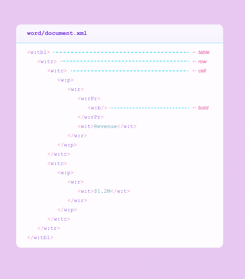 This improvement currently applies to tables in .docx files, where the gap between what the source format knows and what parsers have historically extracted is largest. We're looking at extending similar techniques to other structural elements where the Word XML carries information that would otherwise be lost.
