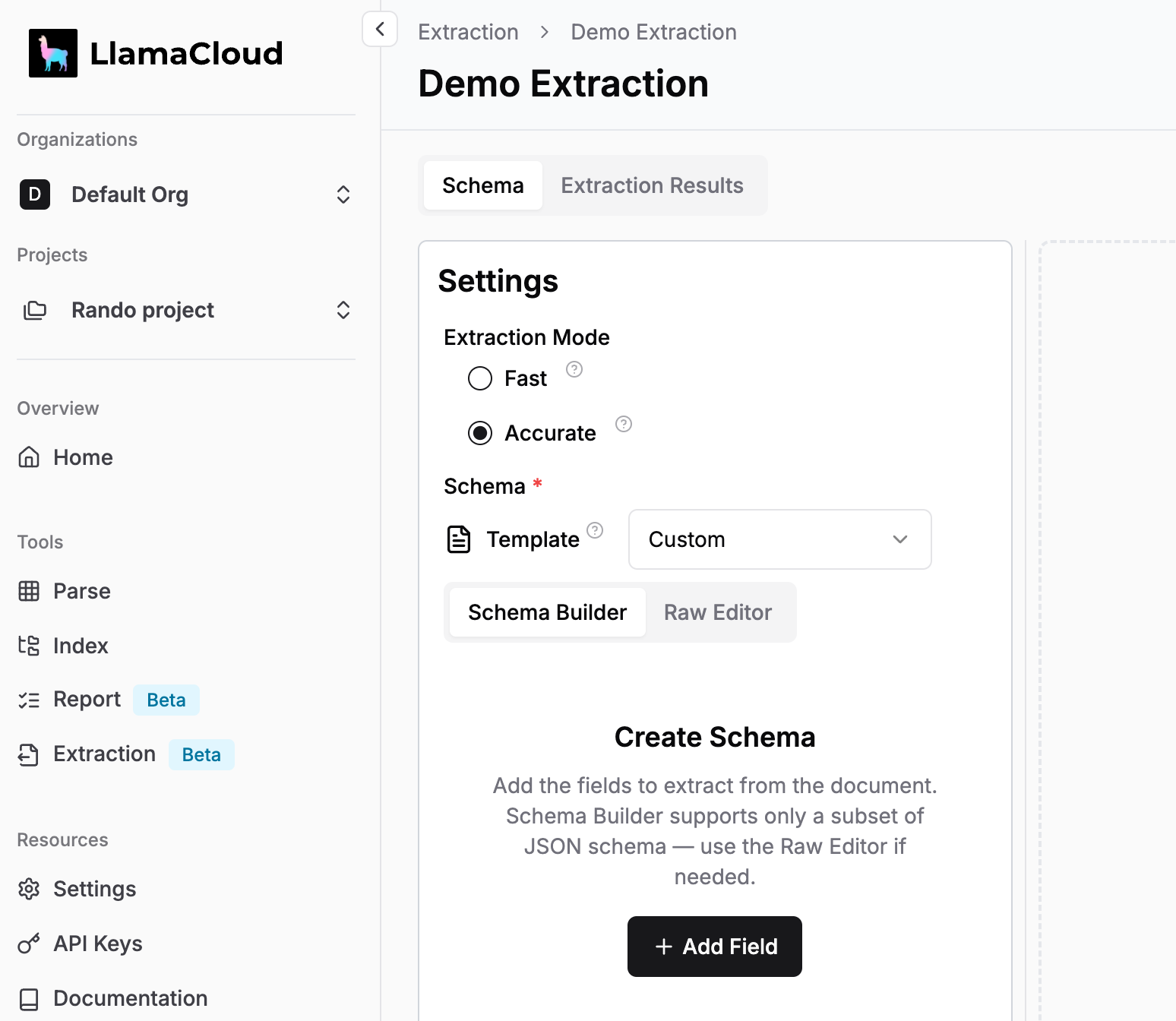 - LlamaExtract allows users to define a schema (either in JSON or via a clickable UI).