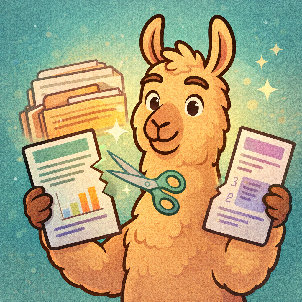 - LlamaSplit Document Segmentation: New beta API that uses AI to automatically classify and separate bundled documents into targeted sections based on your defined categories, with exact page ranges and confidence scores. Blog Post, Docs