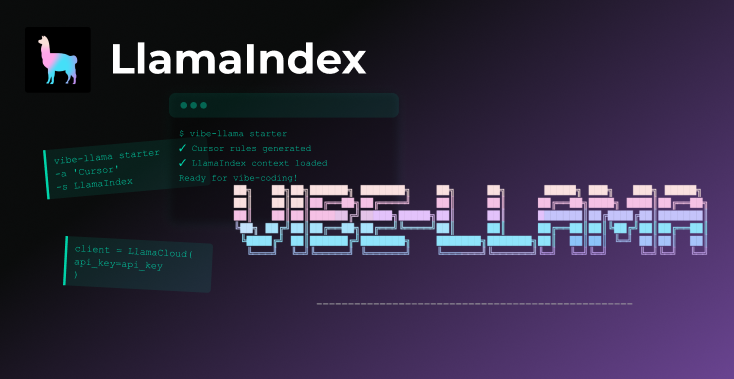 for a command-line UI that walks you through the options, or if you already know what you want you can run something like: vibe-llama starter -a 'Cursor' -s LlamaIndex