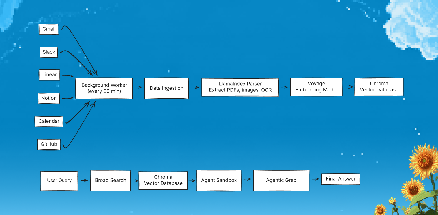 Every 30 minutes, a background worker checks connected tools for new information. Messages, documents, attachments, and images flow into a centralized ingestion pipeline.